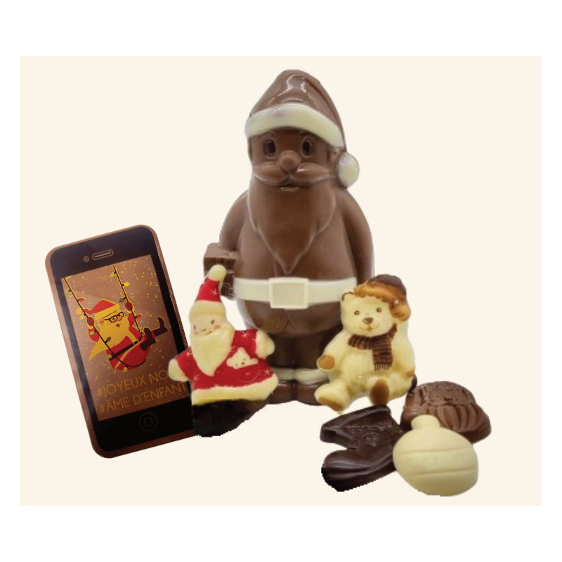 Hotte du Père Noël garni de 150 g de fritures de chocolats assorties, 2 sujets chocolat blanc, 1 smartphone de noël chocolat lait